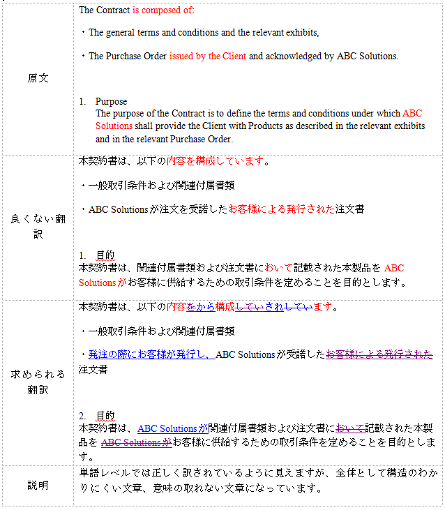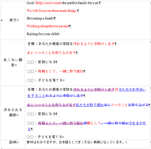 日本語の文章は、英語の文章より長くなる傾向があり、翻訳された日本語は、長くて ぎこちない文章になることがあります。翻訳では、一読して理解できる自然でわか りやすい表現を使うことが重要です。