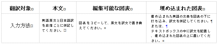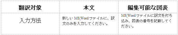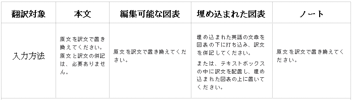 MS Word、MS PowerPoint、 MS Excel、PDF などのファイル形式に応じて、訳文の 入力方法は異なります。また原文と同じファイル形式で訳文を作成する場合と原 文とは異なるファイル形式で訳文を作成する場合があります。下記の表ではまず それぞれのケースごとに、本文、図表の訳文の入力方法を説明します。さらに、 チェッカーがその訳文をどのように修正すべきかを説明します。